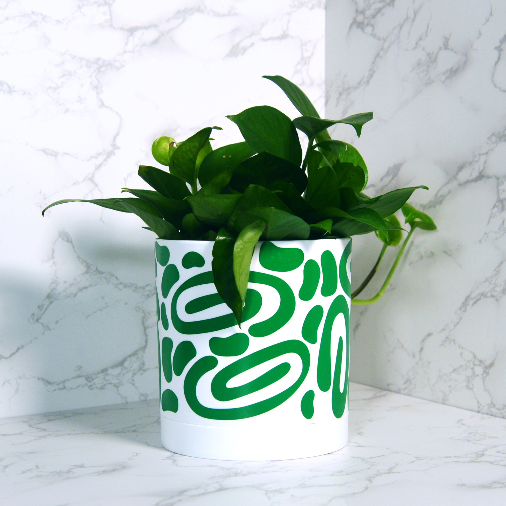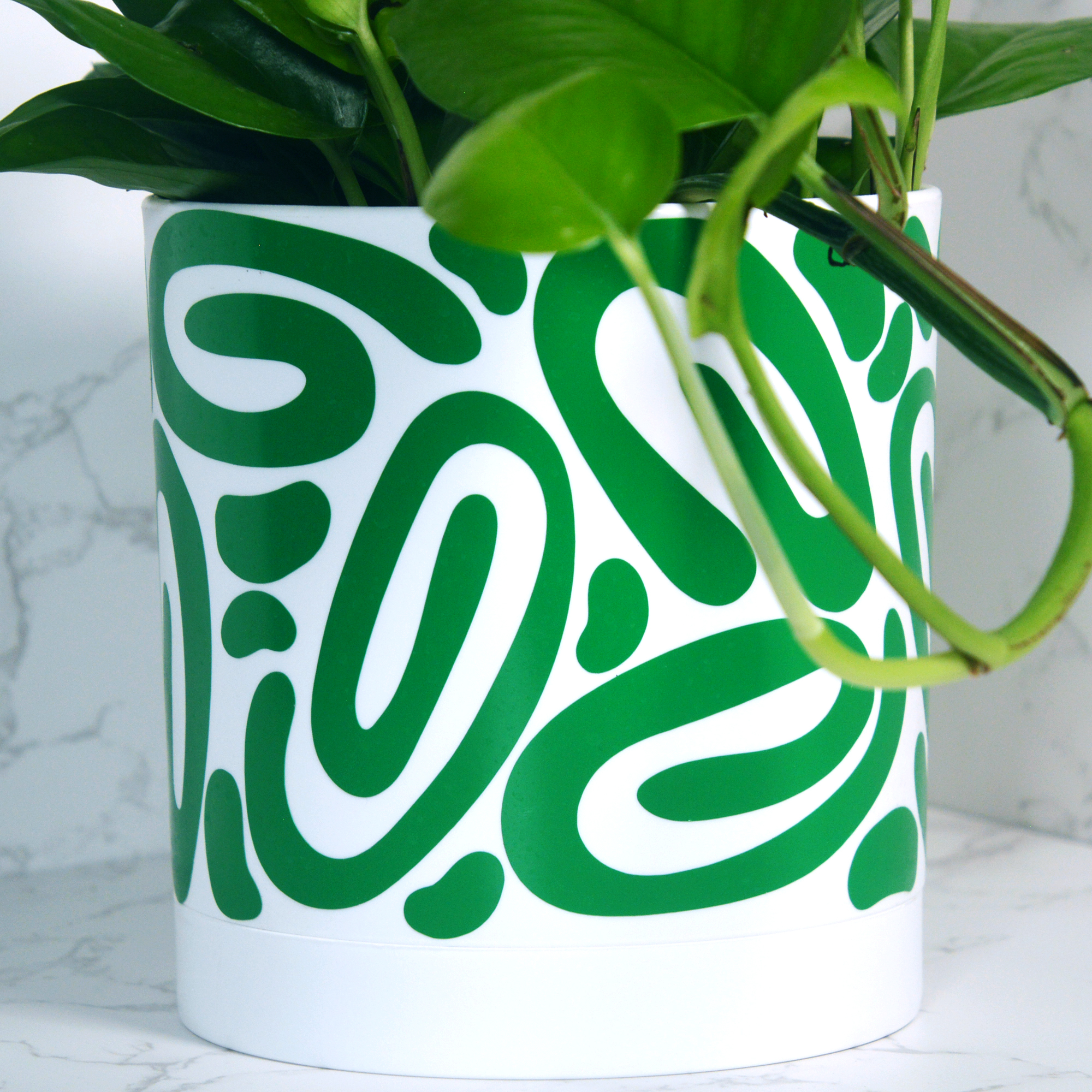 This planter features a bold, modern pattern of organic freeform loops. The repeating swirls give a sense of movement and rhythm, creating a dynamic visual texture that feels both playful and sophisticated. The high-contrast design makes it a standout piece, perfect for adding a touch of artistic flair to any indoor or outdoor space. Whether paired with lush greenery or minimalist succulents, this pattern brings an energetic and contemporary charm to your plant display